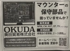 4/18と4/25電波新聞 広告掲載します。「やさしい業界知識」という記事で、SMT関連のトピックが掲載されます。SMT記事と同ページです!! マウンタ保守部品、テープフィーダ、販売・修理の奥田貿易株式会社